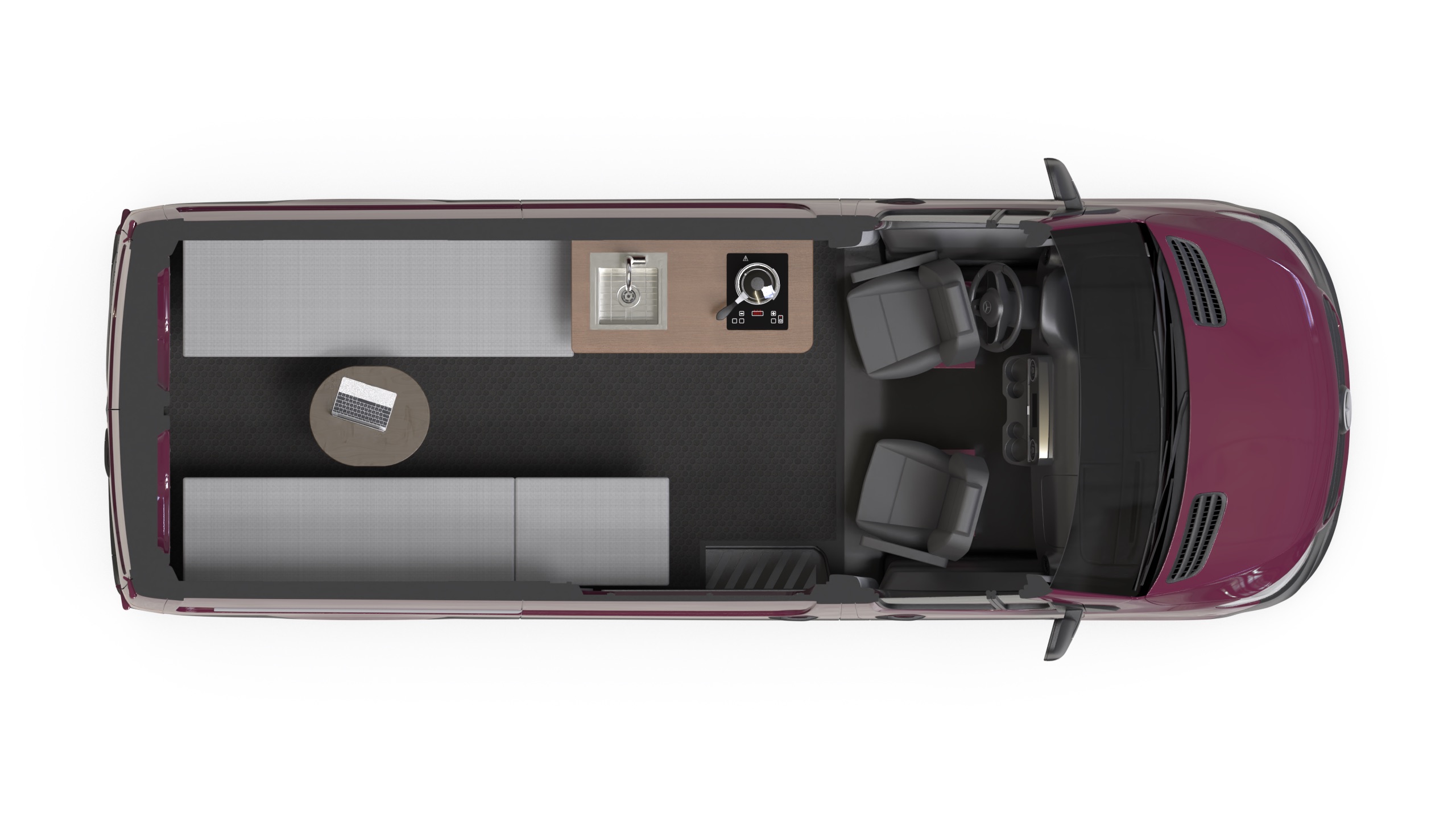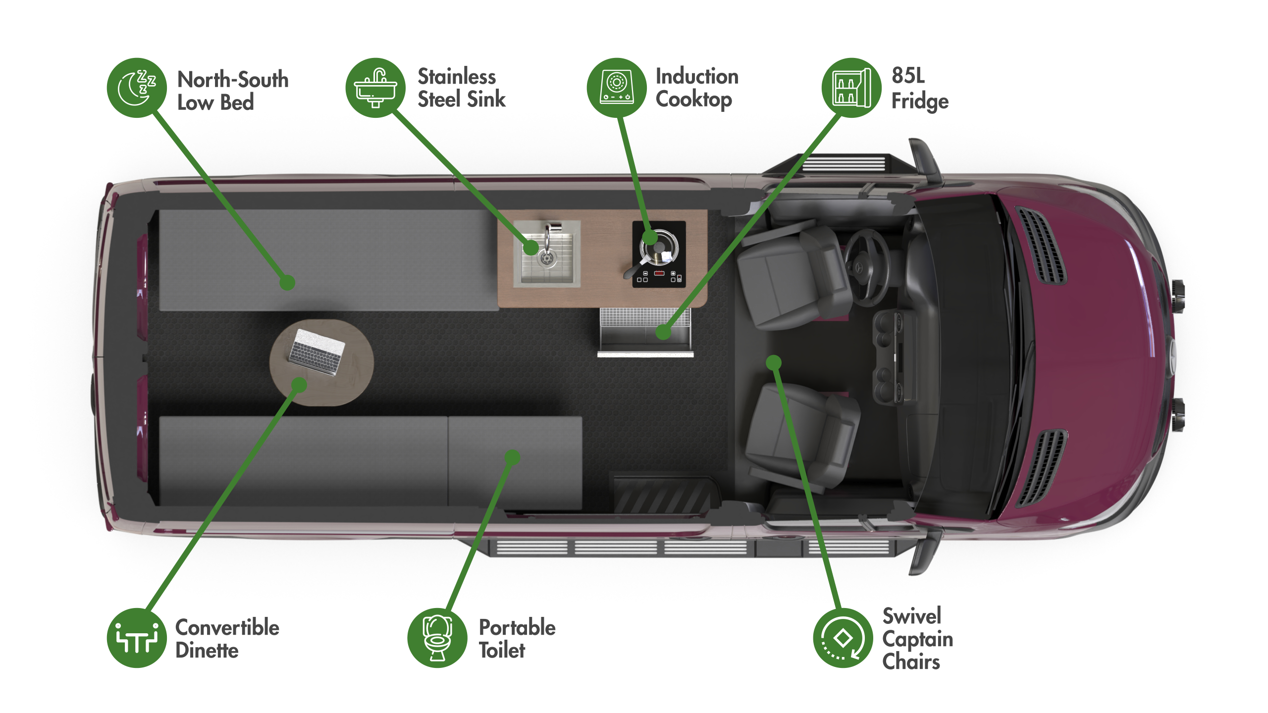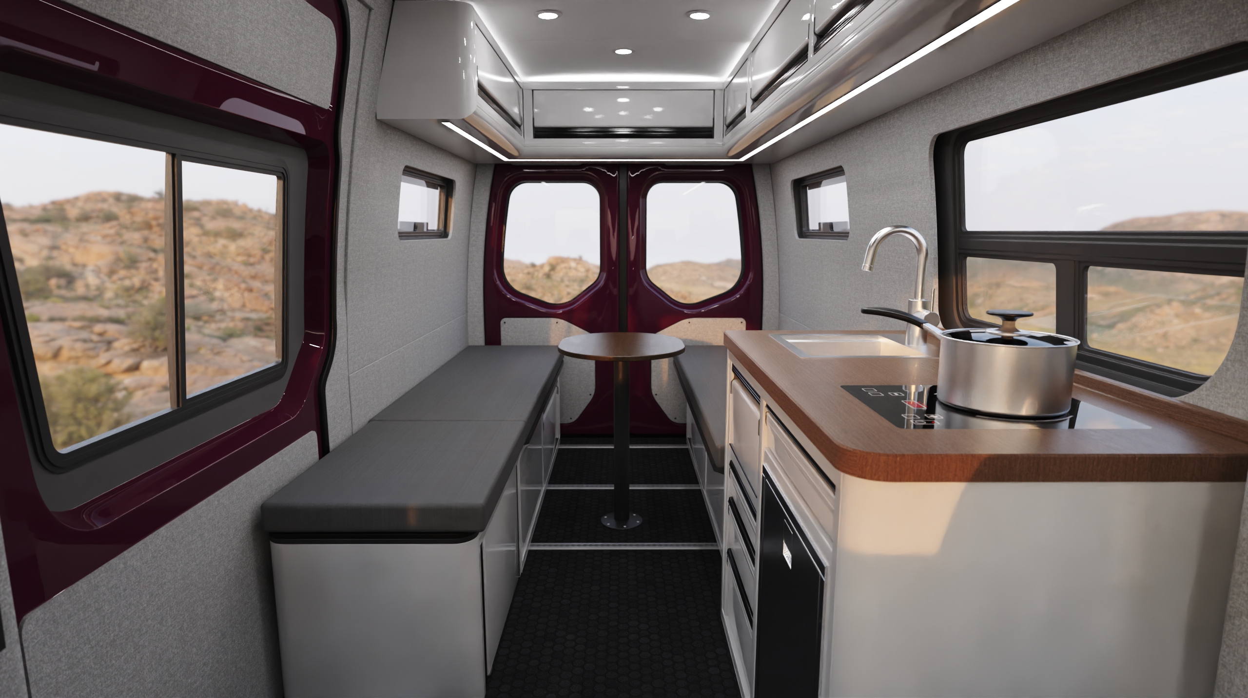 The Archer is built for 2, with a lower bed for easy access and lots of cabinets for ample storage. The hidden dry flush toilet and TOURIG portable shower maximize interior living space.