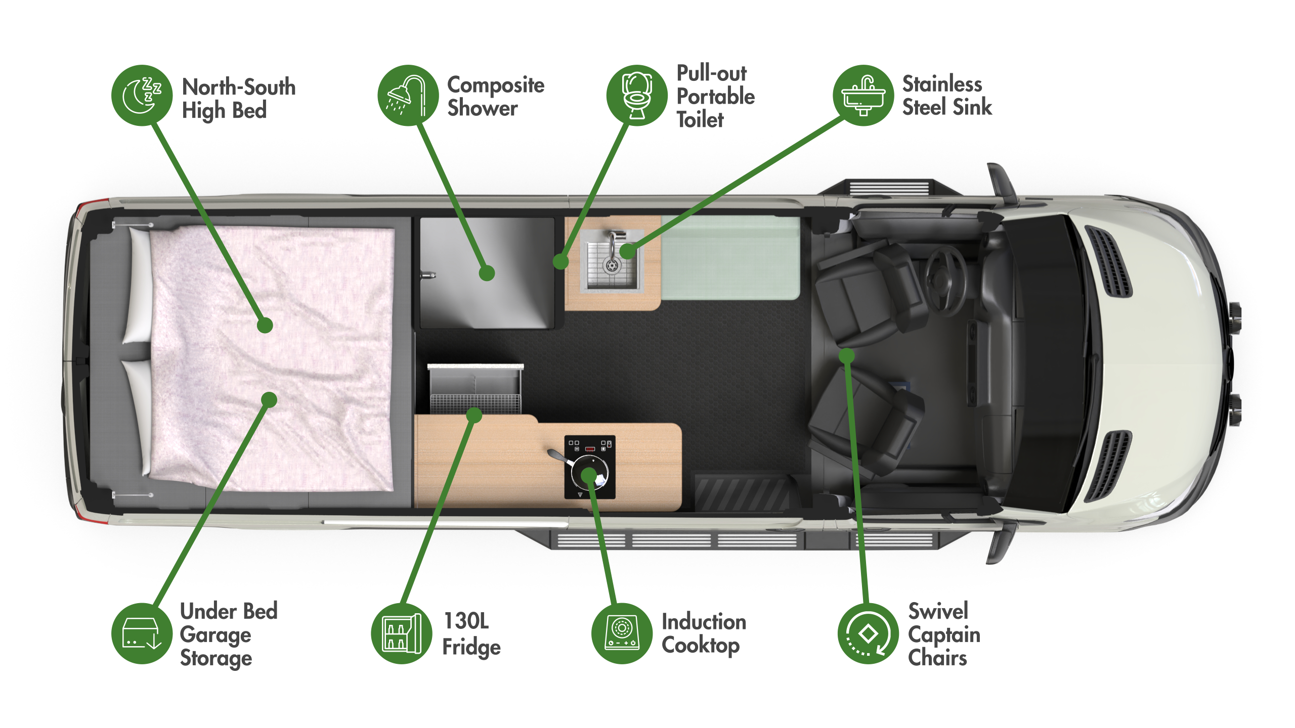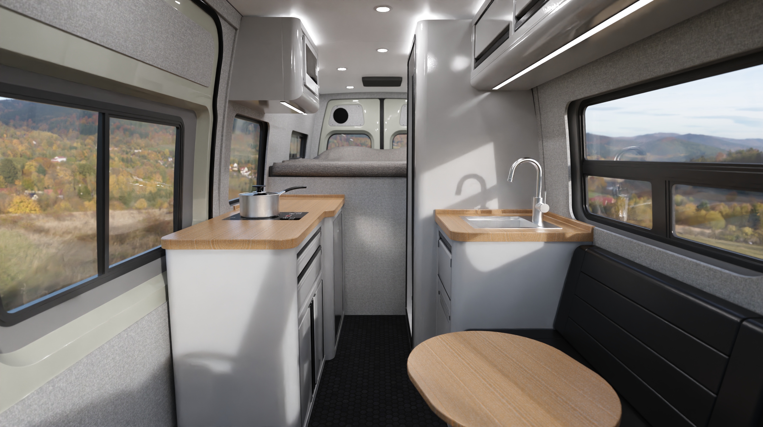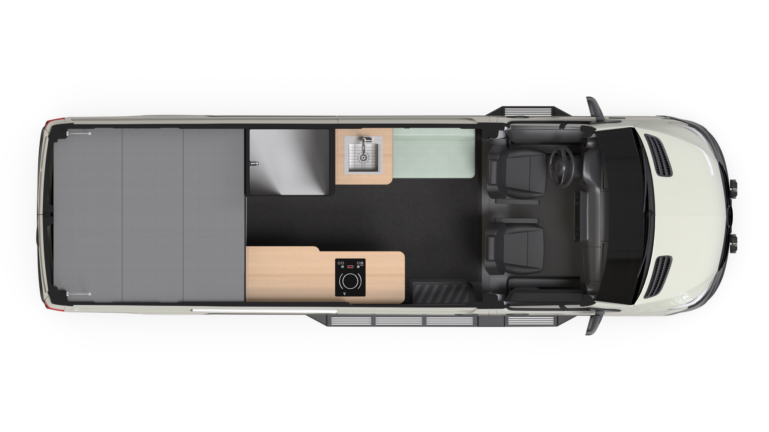The Banner is the most popular van in TOURIG's history! Seating and sleeping for 2, a full composite wet bath, and a full-feature split galley make this a proven floor plan for the past 6+ years.