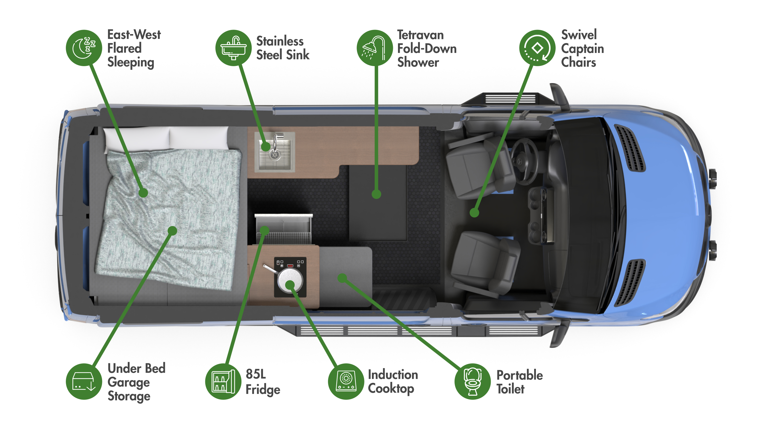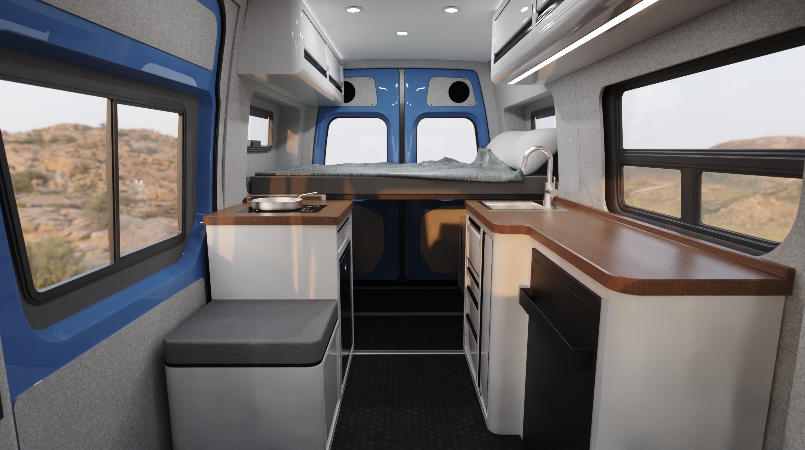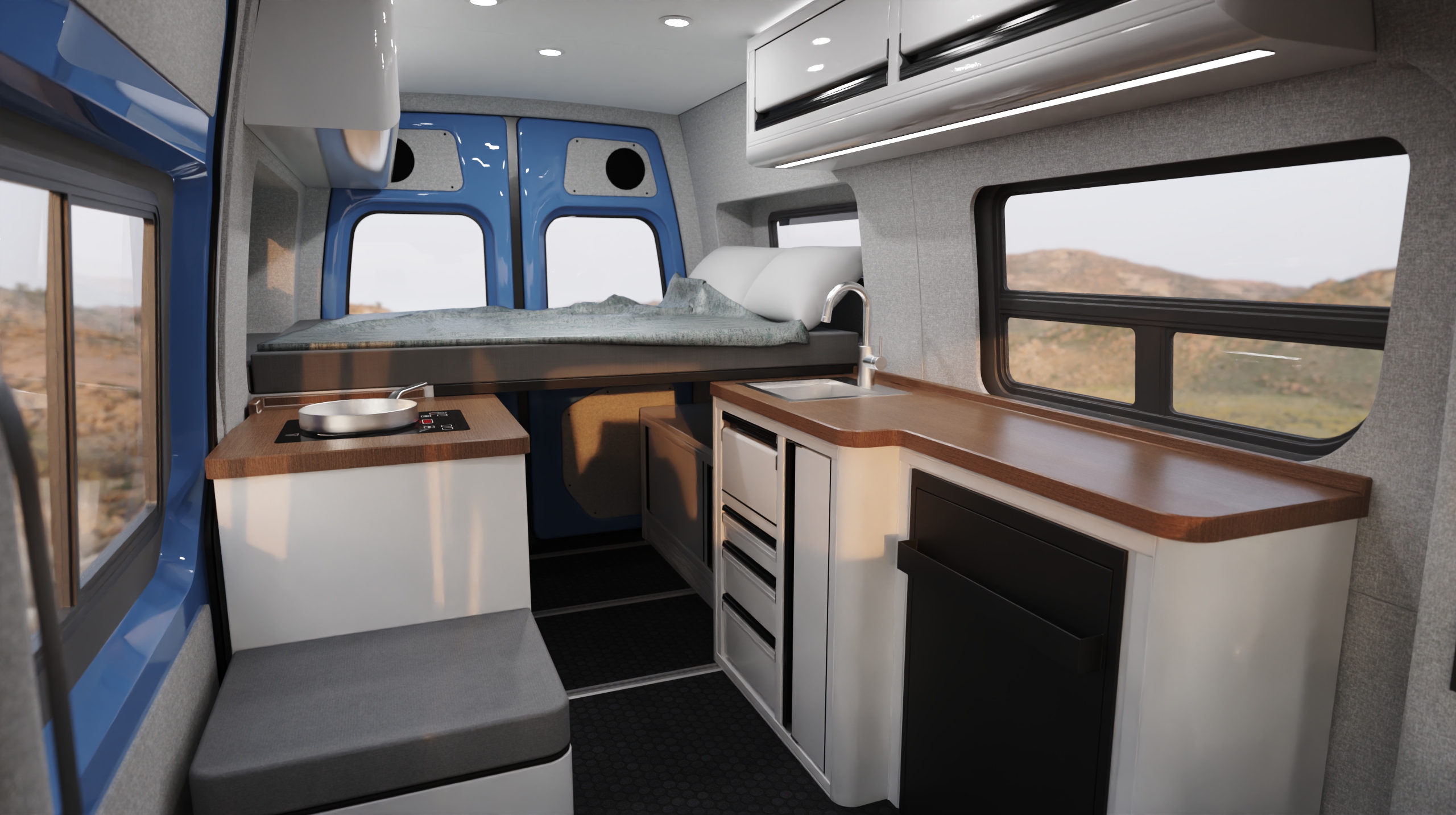 The Dexter plays off the proven Drifter model but adds a split galley for greater counter top space. A hidden, drop-down shower maximizes interior space without sacrificing creature comforts.