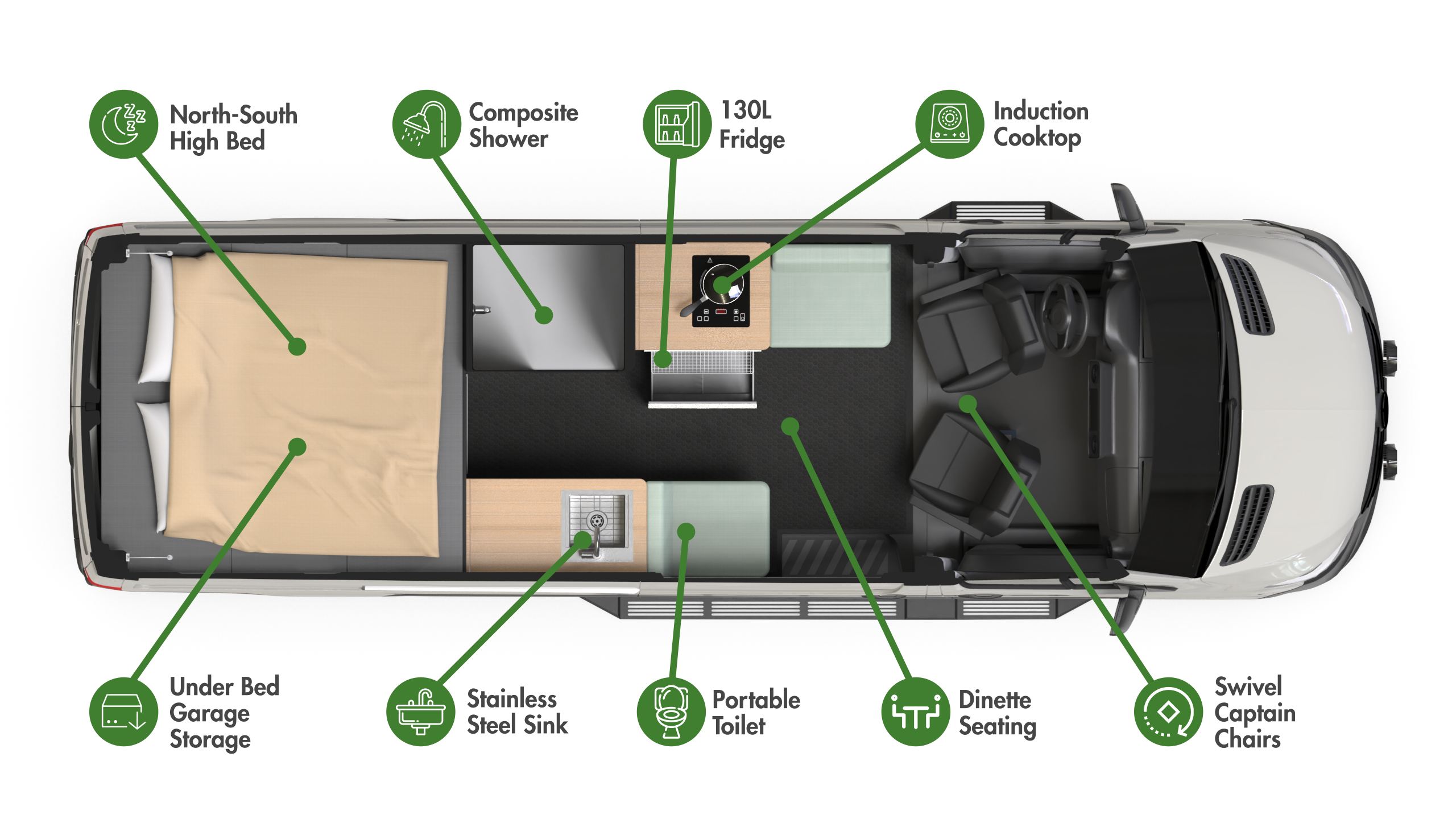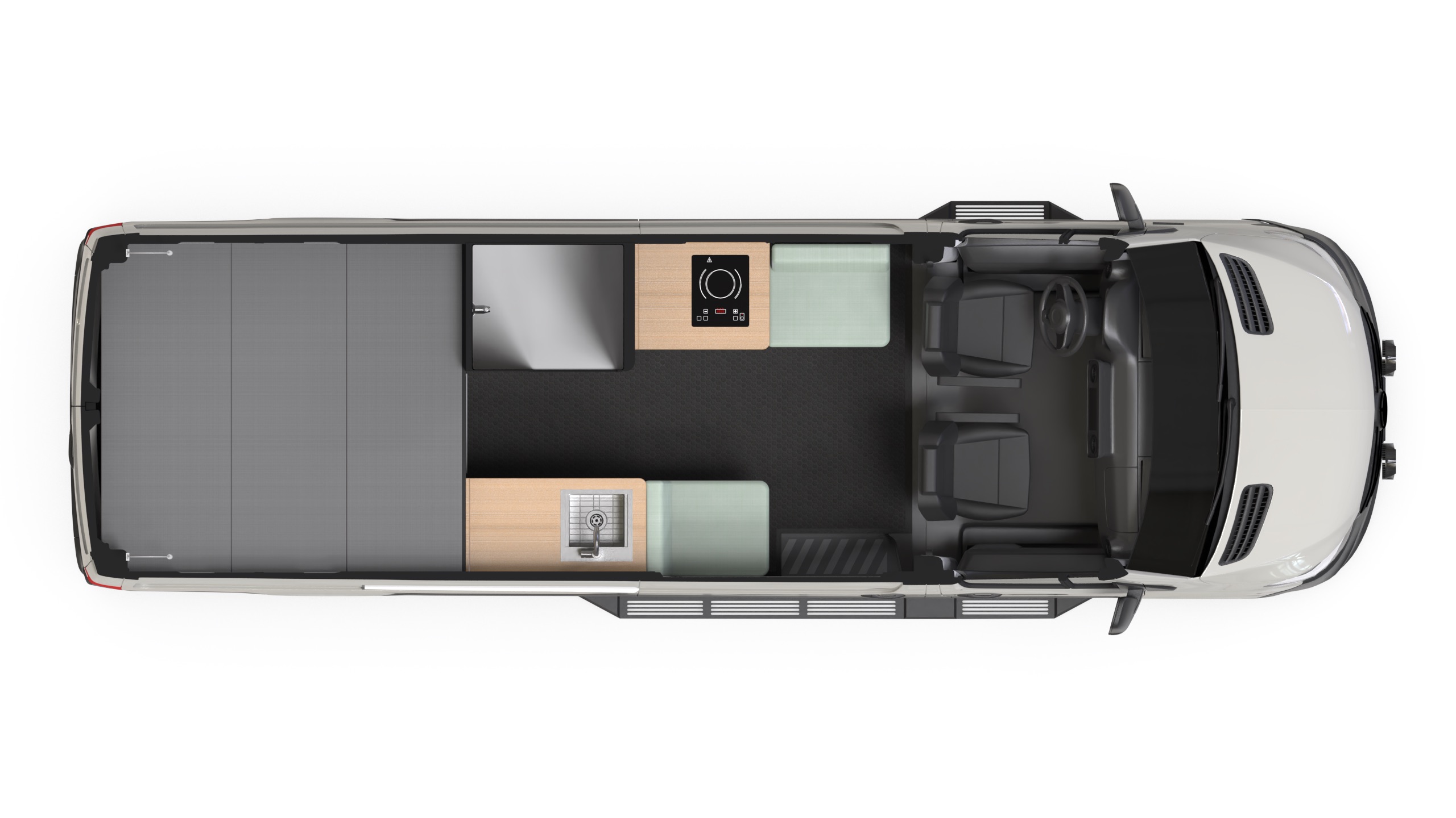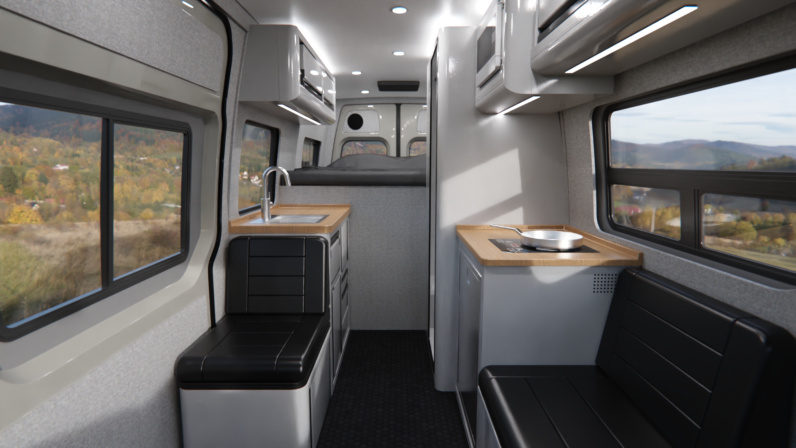 The River takes our best-selling Banner model and splits the rear seating into two smaller settees. With a full-feature wet bath, split galley, and large dedicated garage, this van has an open feel without sacrificing amenities.