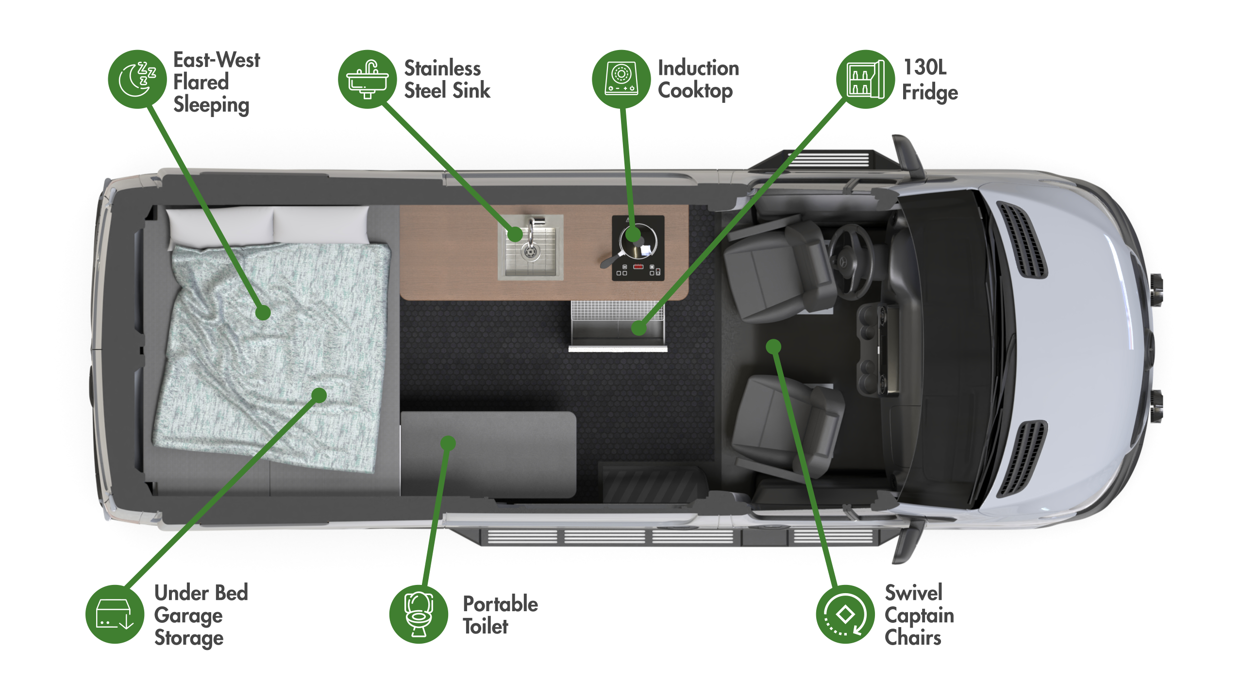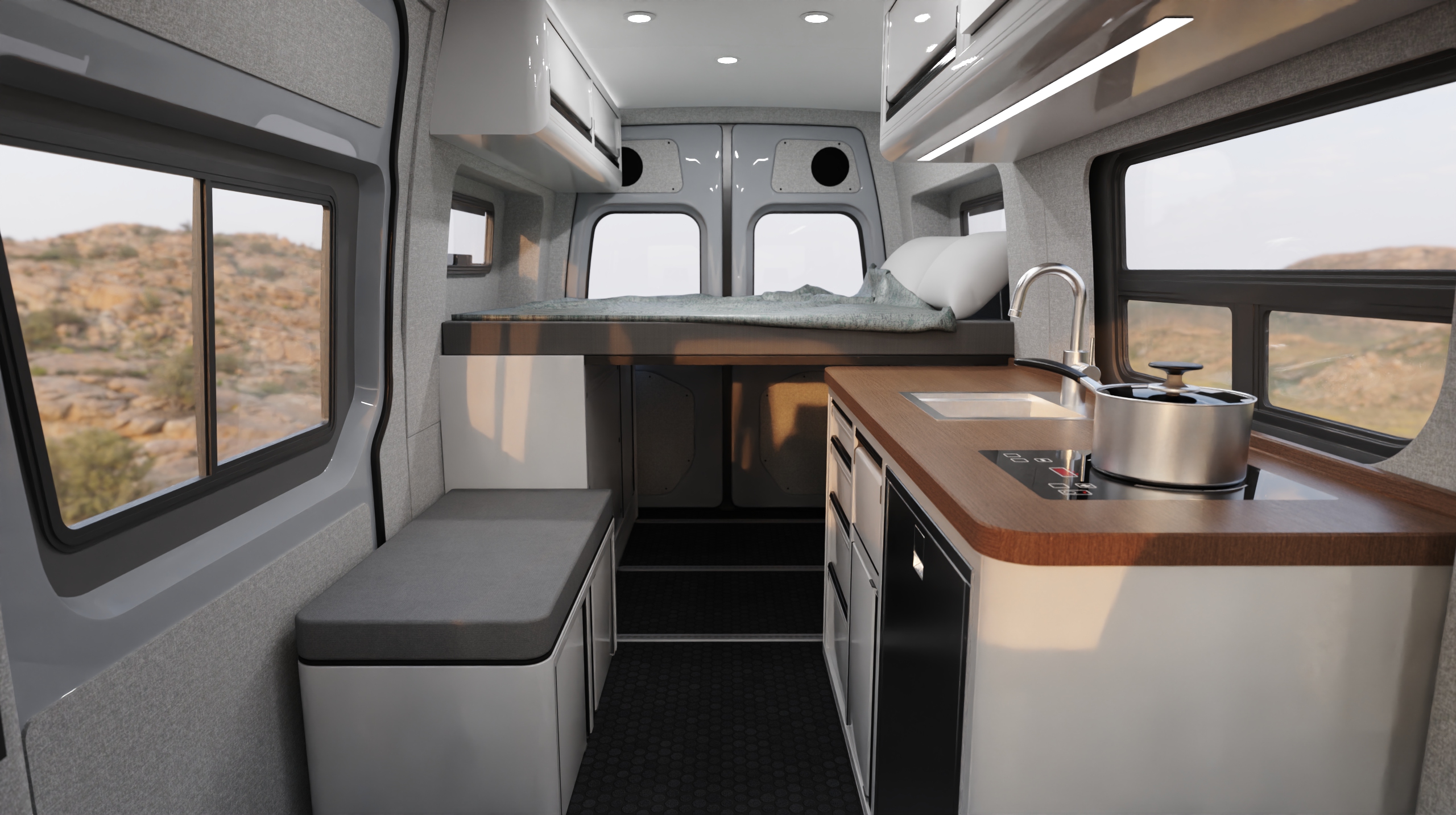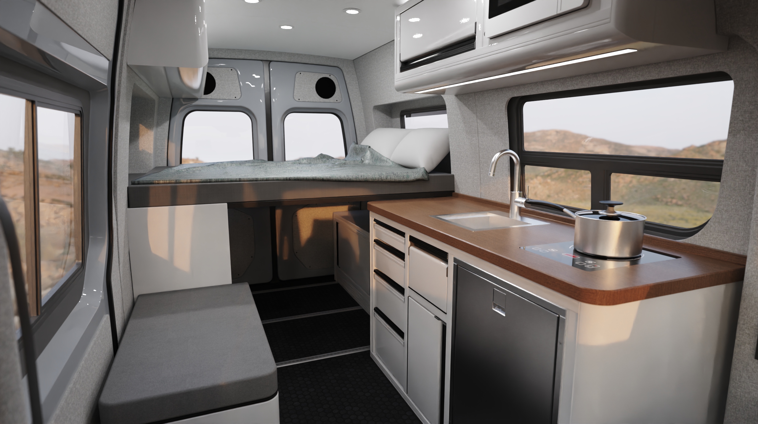 The Ryder is designed for 2, featuring a hidden composting toilet, TOURIG portable shower, and galley with full amenities.