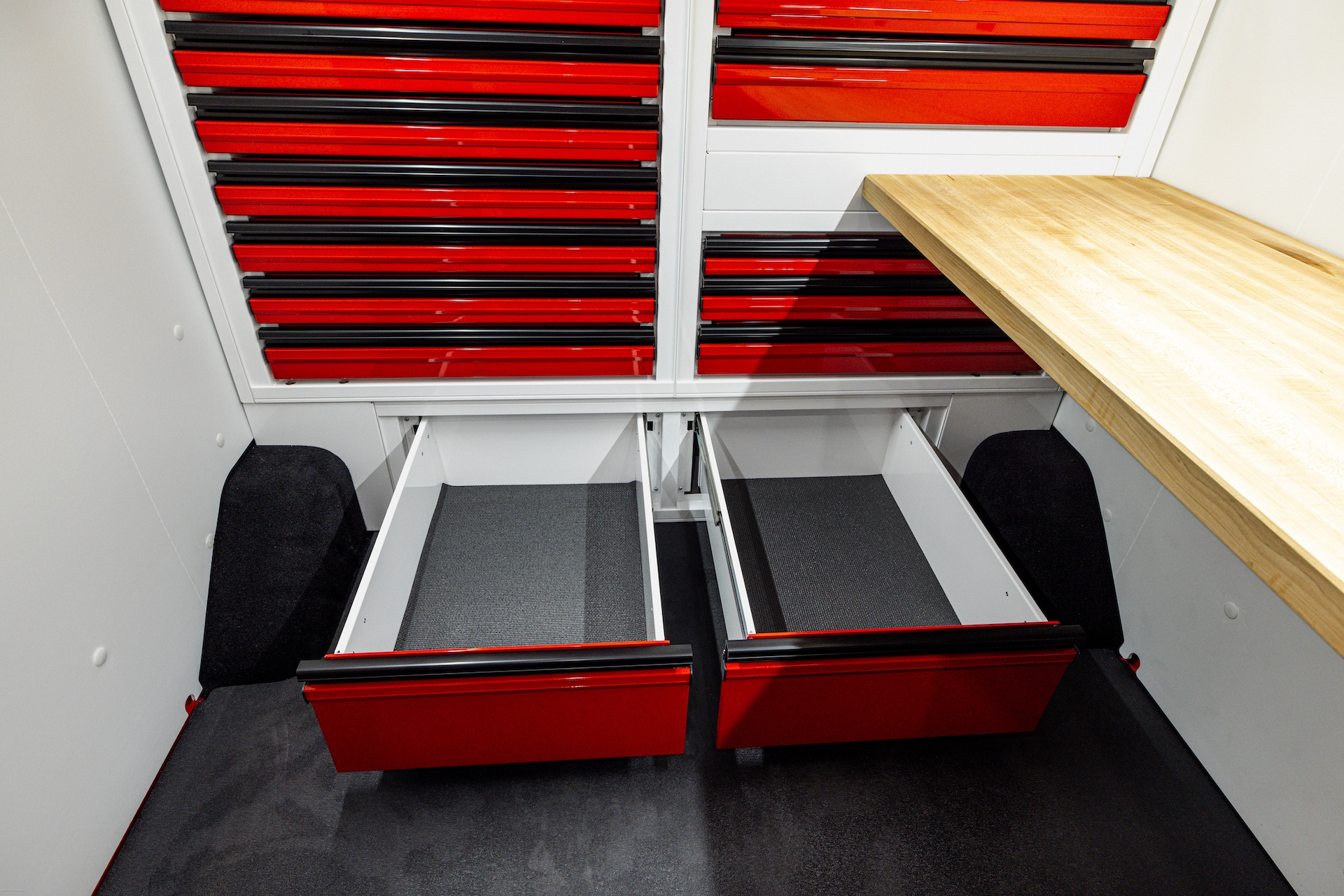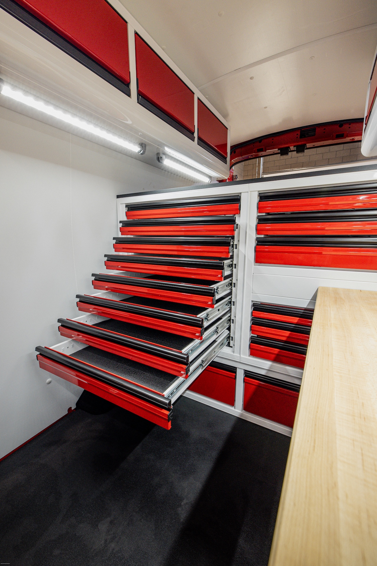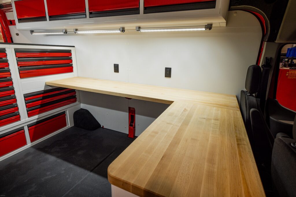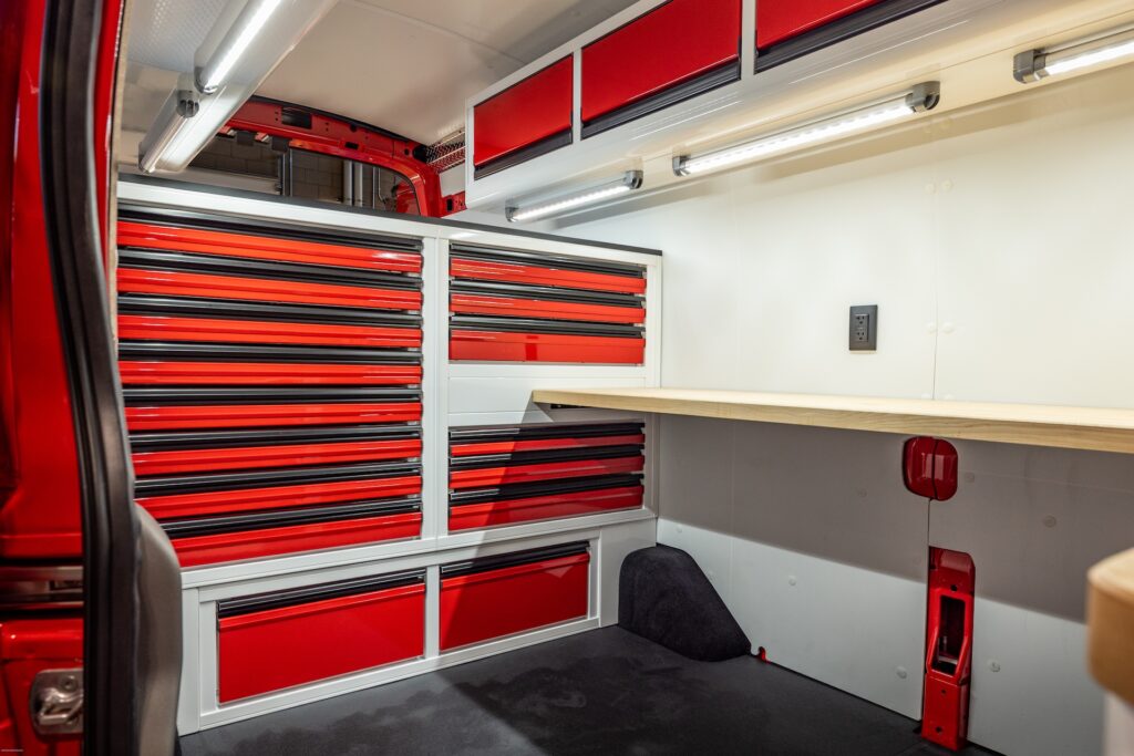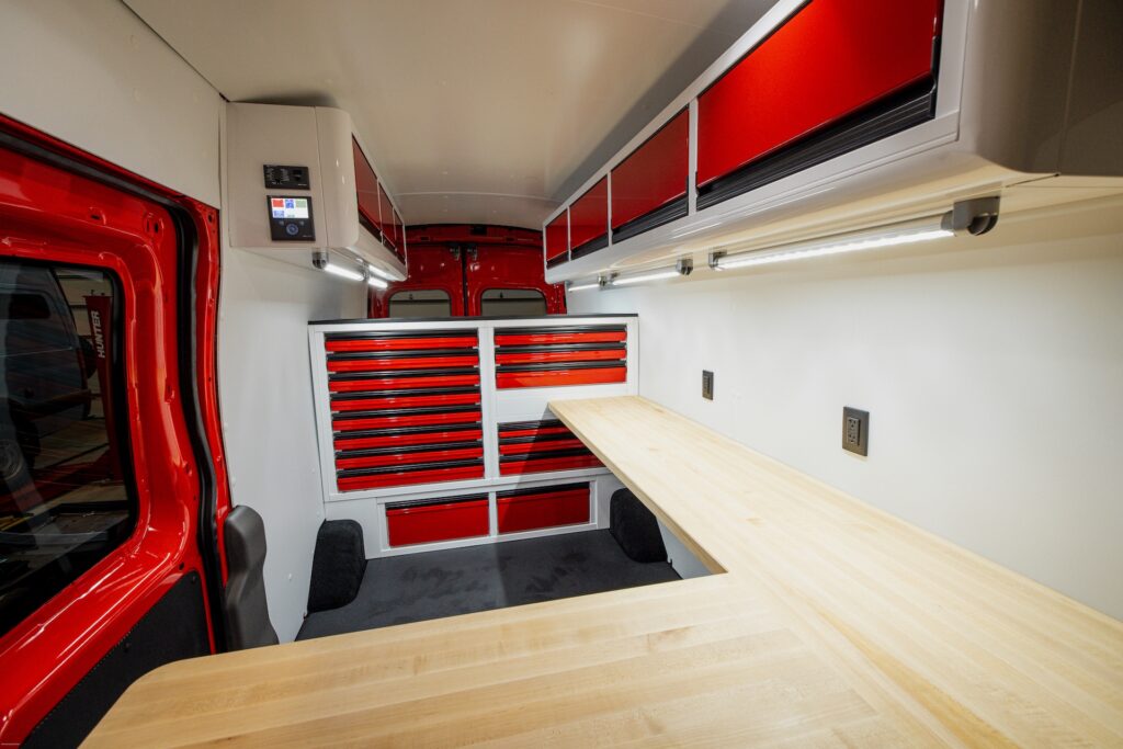 From the outside, the van looks like an ordinary work van, exactly as the owner wanted: unassuming, easy to park, and able to blend in. But step inside and it’s a whole different story. With strong, lightweight C-Tech X TOURIG aluminum cabinets, bright white walls with bold red accents, maple butcher block countertops, and efficient LED lighting, this build feels modern, clean, and built to last.