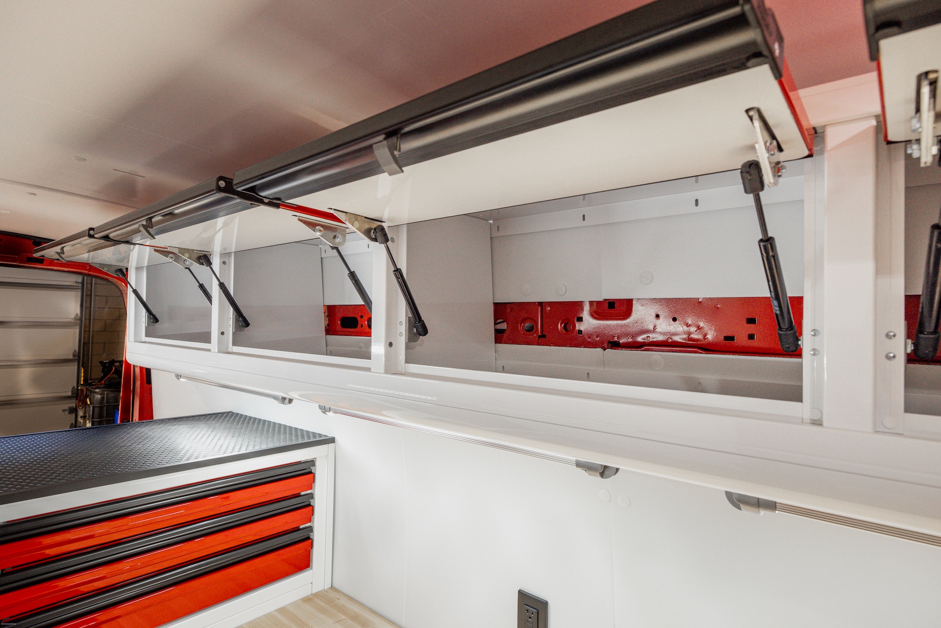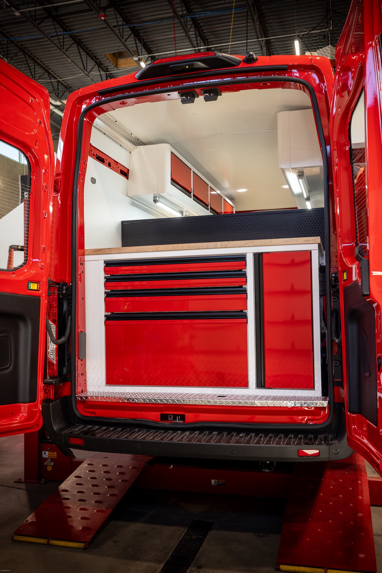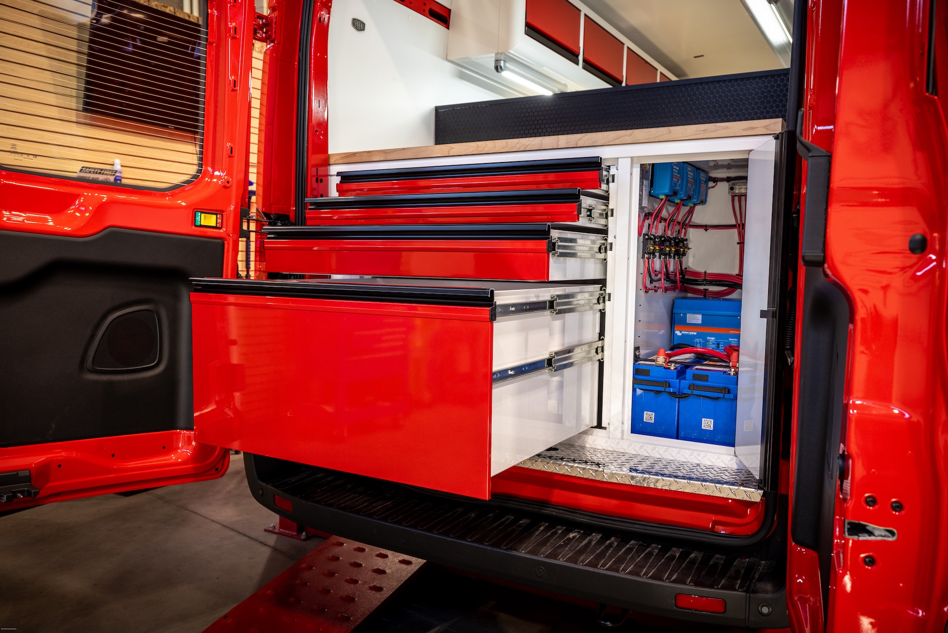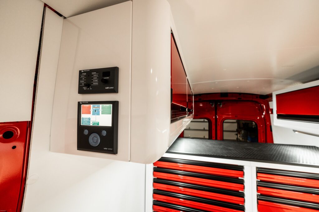 From the outside, the van looks like an ordinary work van, exactly as the owner wanted: unassuming, easy to park, and able to blend in. But step inside and it’s a whole different story. With strong, lightweight C-Tech X TOURIG aluminum cabinets, bright white walls with bold red accents, maple butcher block countertops, and efficient LED lighting, this build feels modern, clean, and built to last.